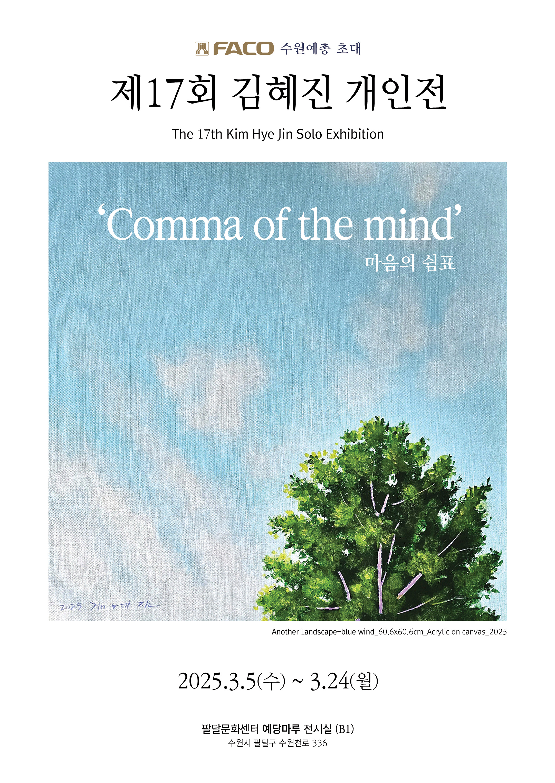 2025년 3월 김혜진 작가 초대전 작성자 : 시스템 관리자 작성일 : 2025.03.05 조회 : 205 2025년 3월 김혜진 작가 초대전 제17회 김혜진 개인전 The 17th Kim Hye Jin Solo Exhibition 'Comma of th mind' 마음의 쉼표 2025.03.05.WED ~ 03.24.MON 10:00 -18:00 *공휴일 및 월요일 휴관 팔달문화센터 B1F 첨부파일 도시문화 커뮤니티 네모의 꿈 아파트 학교 활동기록집.pdf 목록