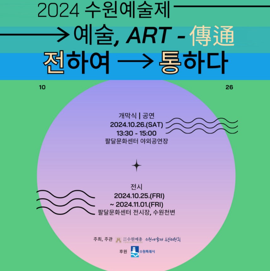 2024 수원예술제 일시 : 2024.10.15 ~ 2024.10.26 2024년 10월 26일(토) 13:30 - 15:00 장소 : 팔달문화센터 첨부파일 2024수원예술제에 초대합니다. 일시 : 10월 26일 13시30분 장소 : 팔달문화센터 야외공연장 목록