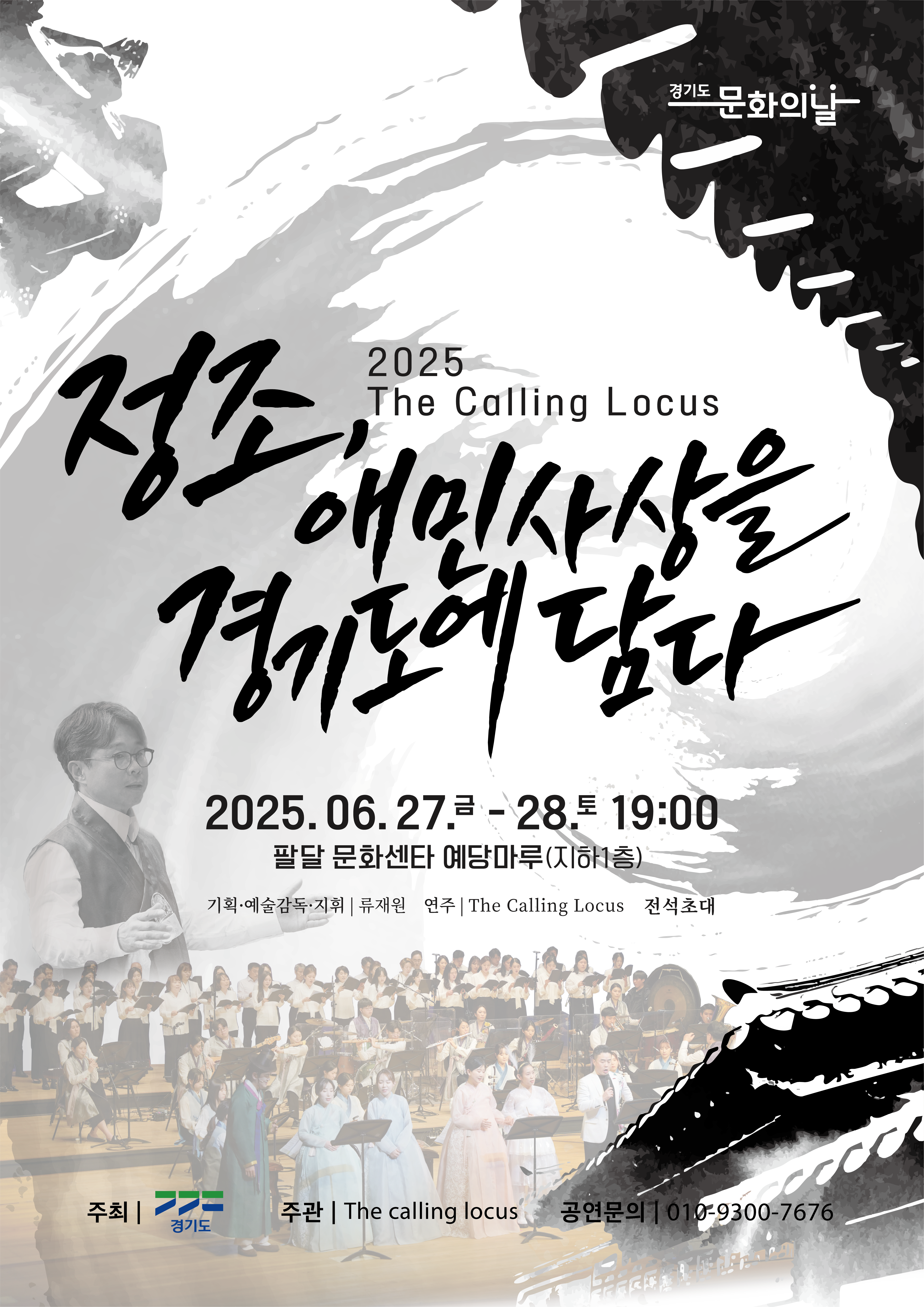 정조, 애민사상을 경기도에 담다 (국악공연) 일시 : 2025.06.27 ~ 2025.06.28 19:00 ~ 20:00 주최 : 경기도, 더 콜링 로커스 경기지부 장소 : 팔달문화센터 공연장(예당마루) 첨부파일 정조,애민사상을 경기도에 담다 팜플렛 (1).png 정조,애민사상을 경기도에 담다 팜플렛 (2).png 정조,애민사상을 경기도에 담다 팜플렛 (3).png 정조,애민사상을 경기도에 담다 팜플렛 (4).png ※본 공연은 전석 초대이며, 남녀노소 누구나 무료로 관람하실 수 있습니다.※ 목록