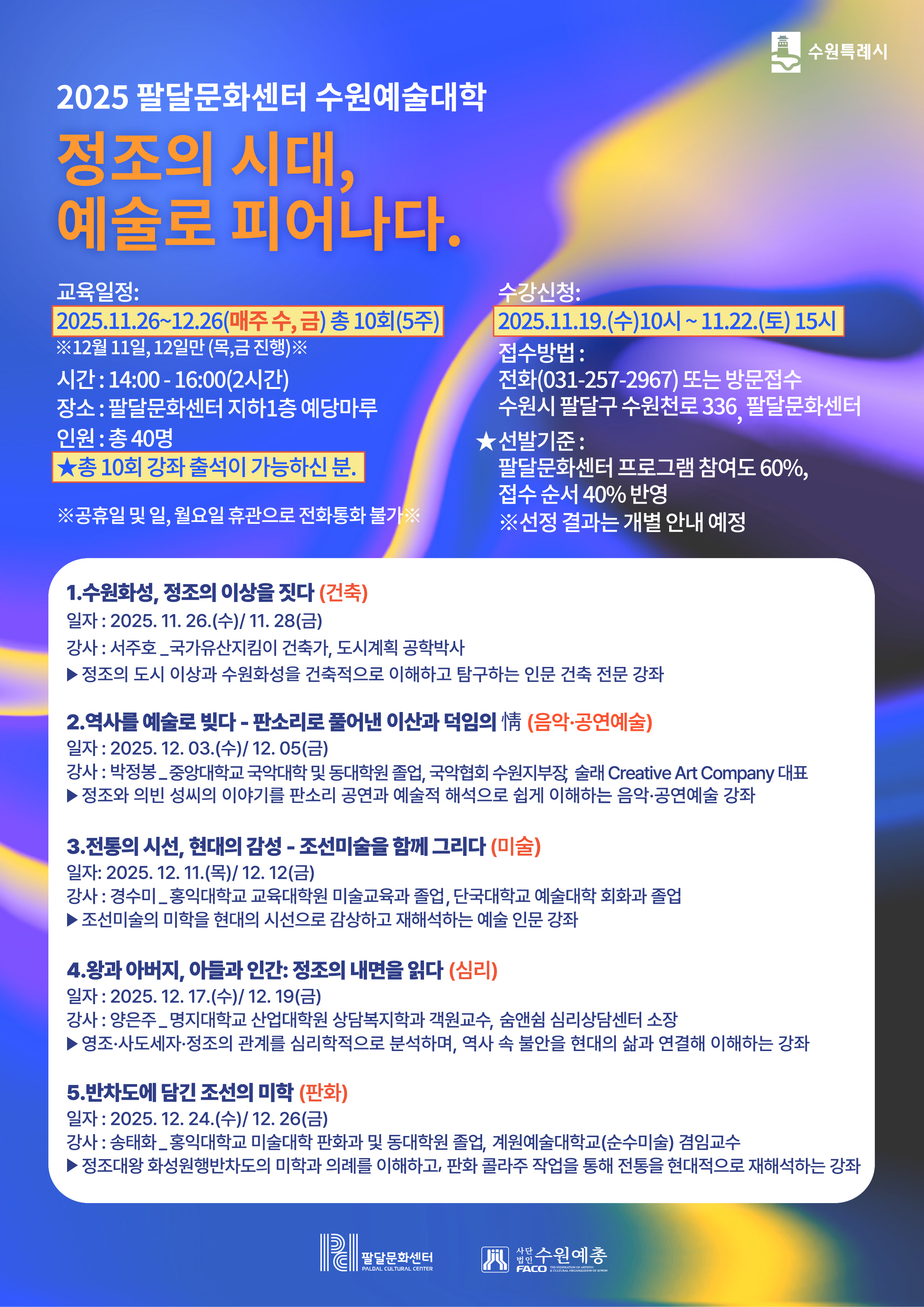 2025 팔달문화센터 수원예술대학 '정조의 시대, 예술로 피어나다' 일시 : 2025.11.12 ~ 2025.12.31 2025 팔달문화센터 수원예술대학 '정조의 시대, 예술로 피어나다' 장소 : 팔달문화센터 첨부파일 강의는 매주 수, 금(총 10회, 5주) 진행됩니다. ※12월 11일, 12일만 목, 금 진행 목록