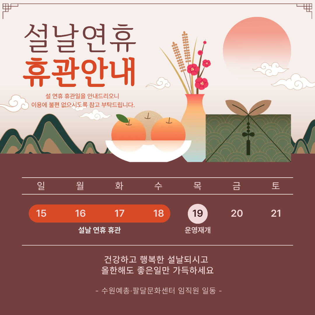 2026.02.14 ~ 2026.02.18 팔달문화센터 설연휴 휴관안내