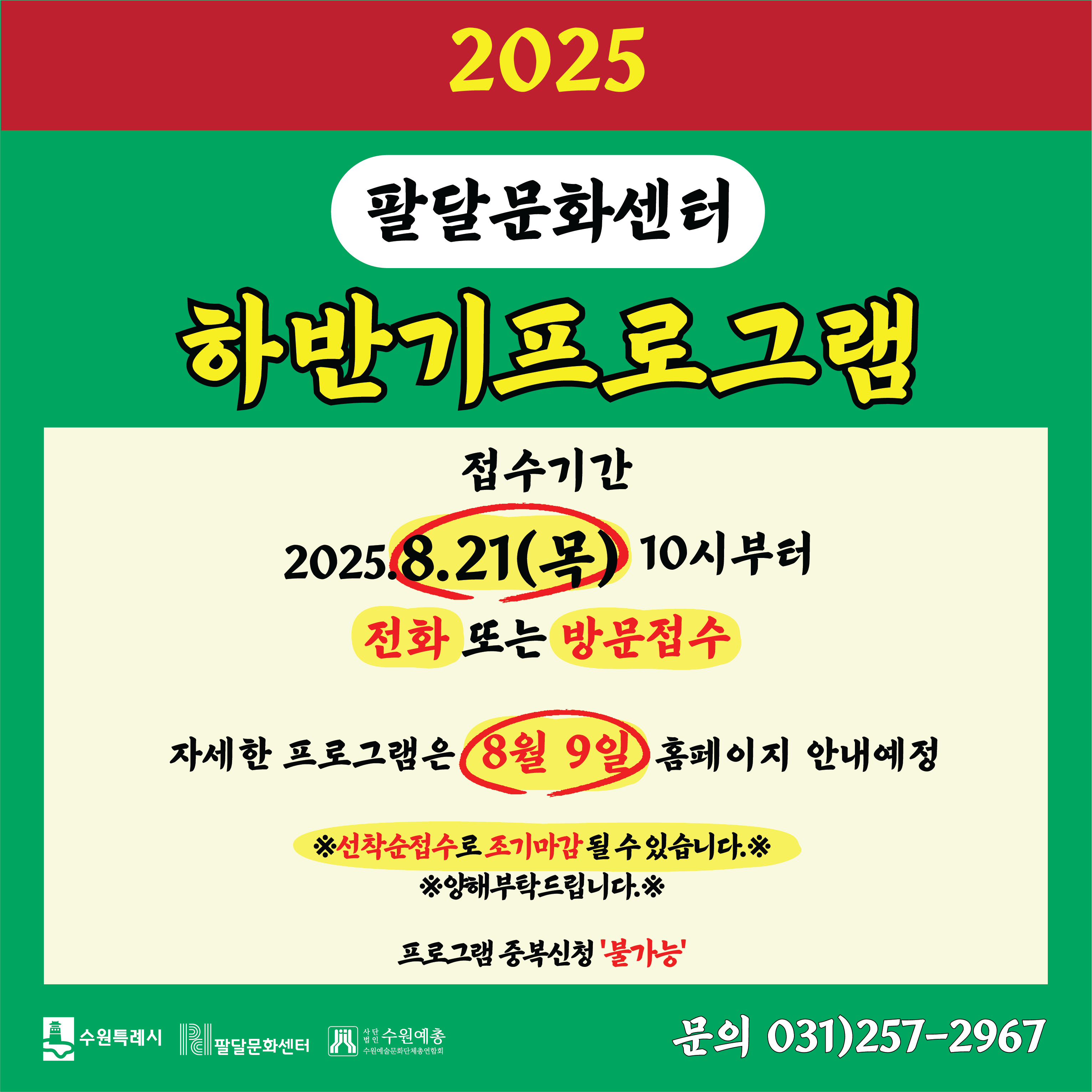 게시판 요약 공지사항 2025.1104 2025 팔달청년예술 통합창작 프로젝트「SAY :연결하는 감각들」 참여 작가 공모 more + 공지사항 2025.0731 2025년 팔달문화센터 하반기 강사 공개모집 공고 more + 공지사항 2025.0718 팔달문화센터 이메일 변경 안내 more + 공지사항 2025.0612 2025년 수원예총 직원 채용공고_차장 more +
