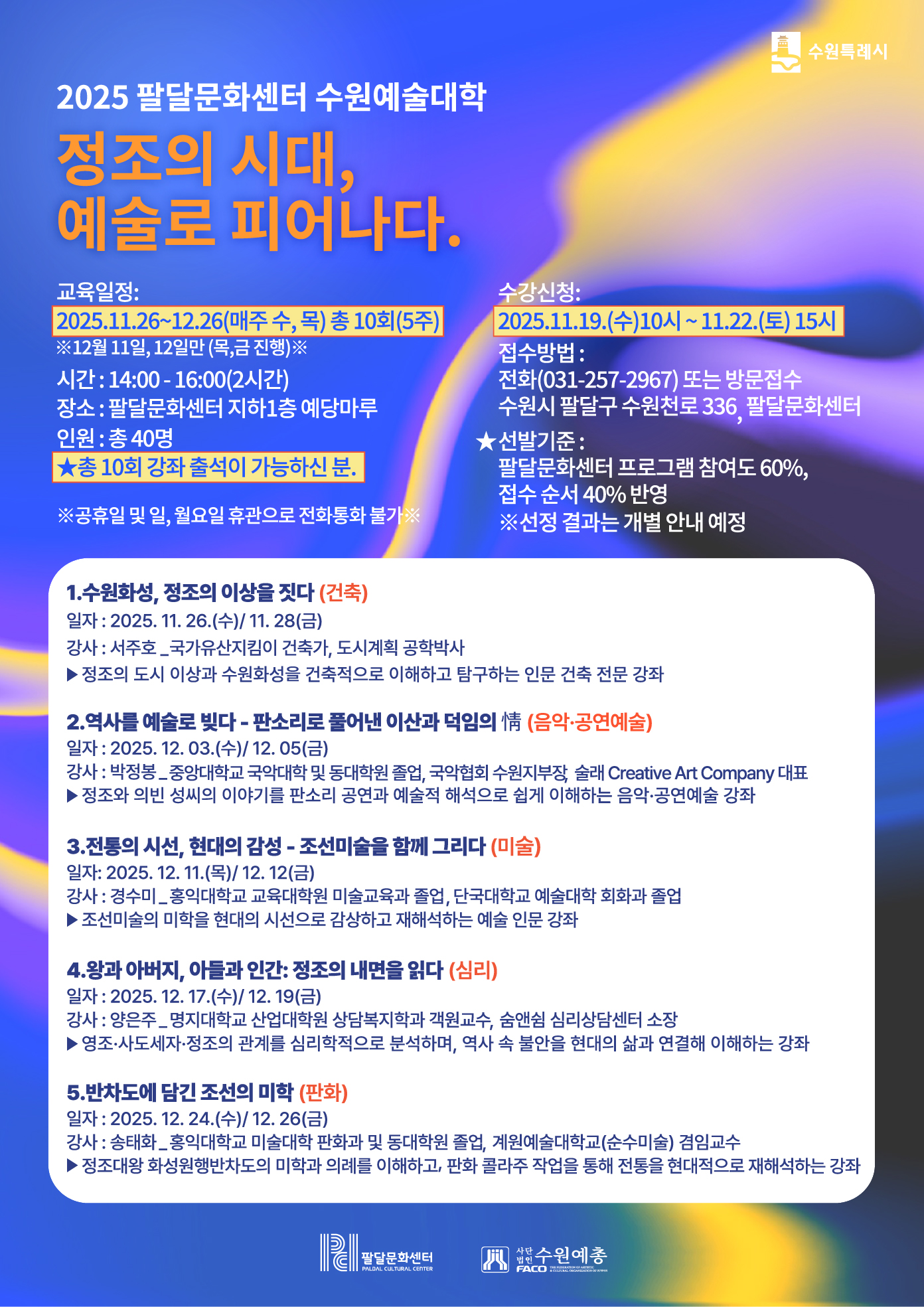 Culture program 문화 프로그램 팔달문화센터에서 다양한 프로그램을 만나보세요. 이전 멈춤 다음 view all 교육 2025 팔달문화센터 수원예술대학 '정조의 시대, 예술로 피어나다' 일시 2025.11.12 ~ 2025.12.31 2025 팔달문화센터 수원예술대학 '정조의 시대, 예술로 피어나다' 장소 팔달문화센터 자세히 보기 행사 2025.10.17 개강<영상으로 기록하는 나의 이야기> 일시 2025.09.24 ~ 2025.11.21 프로그램 신청기간 2025.10.17(10시)부터 장소 팔달문화센터 자세히 보기 교육 2025 팔달문화센터 하반기 프로그램(접수마감) 일시 2025.08.09 ~ 2025.11.28 프로그램 신청기간 2025.08.21(10시)부터 장소 팔달문화센터 자세히 보기